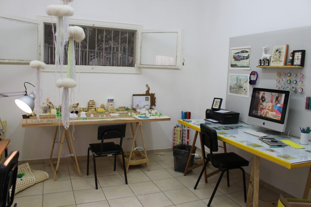 ברגע שראיתי את החדר שלהן, התלהבתי. שלוש פינות עבודה בחדר אחד? איזה כיף! כל פינה שונה ומעניינת, בהתאם לעיסוק של בעלת הפינה. והכל במרחב עבודה אחד: חדר אחד שבו יש יצירה ושיחה ולפעמים גם הילדים שלהן מגיעים להתארח. צמוד לחדר יש מרפסת קטנה שבה הן עורכות סדנאות בשעות אחר הצהרים, אליהן יכולים להגיע ילדים ולהתנסות בכל מיני חומרי יצירה, וגם מתקיימות שם קייטנות במהלך הקיץ. מקום קסום בהחלט, קטן וחמוד באמצע ההמולה התל אביבית.