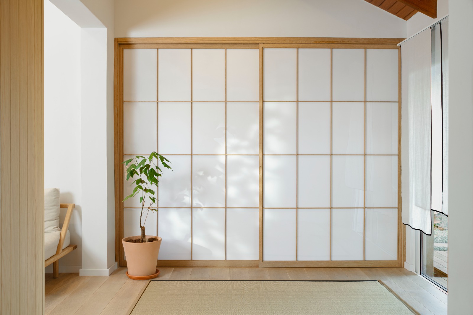 "דלת ה- SHOJI היא אלמנט מפתח בעיצוב הבית: עשויה מעץ מלא ומקשרת בין מבואת הכניסה לחדר המשחקים. הדלת מאפשרת דינמיות וסגירה של החלל בעת הצורך, תוך שמירה על מעבר אור תמידי רך ונעים. בסביבתה משטחי טאטמי מובנים בפרקט הטבעי, היוצרים פינת מדיטציה ומשחק."