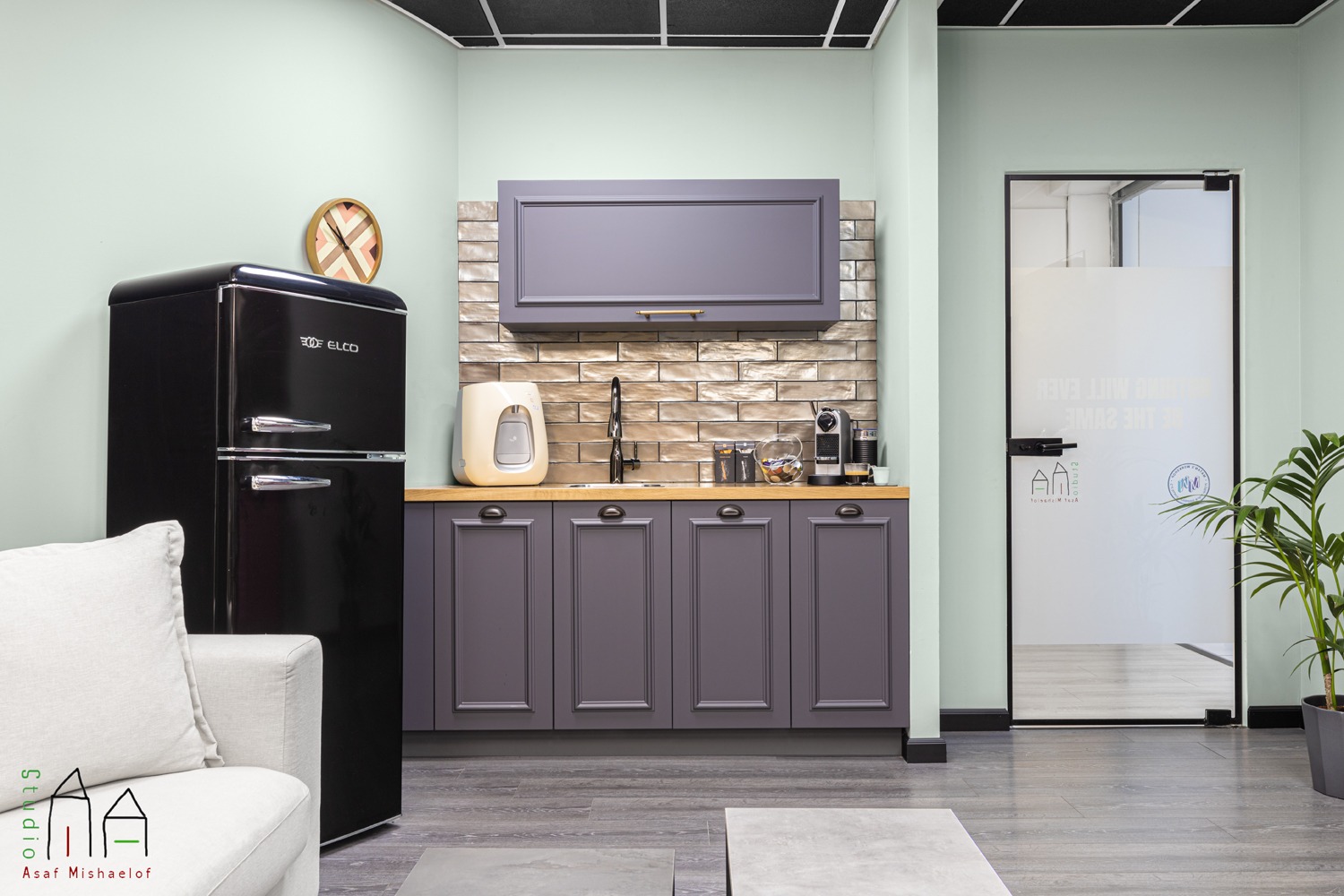 "בפרויקט הזה הלקוחות הם אני ובן זוגי. החלל תוכנן כך שישמש סטודיו לעיצוב פנים בשילוב קליניקה לאימוני קואצ'ינג. הוא ממוקם בבניין משרדים בדרום תל אביב, אזור תעשיה רועש ועמוס, כך שהרצון הראשוני היה ליצור חלל אירוח שקט ומזמין כך שלכל לקוח תהיה הרגשה שהוא נכנס לעולם אחר, מנותק מהסביבה בה הוא נמצא. החלל המקורי היה יחידה אחת פתוחה של 50 מ"ר ללא שום חלוקה, והקונספט שנבחר לעיצוב היה עולם של פנטזיה. התכנון כלל חלוקה של החלל על מנת ליצור חלל מרכזי שישמש כסטודיו, ובנוסף גם חלל טיפולי לפגישות פרטיות. מכיוון שבשעות הערב עורכים במקום סדנאות בנושא העצמה, החלל המרכזי תוכנן כחלל אירוח – מעין סלון גדול. הפרויקט כולו ערך כחודשיים."